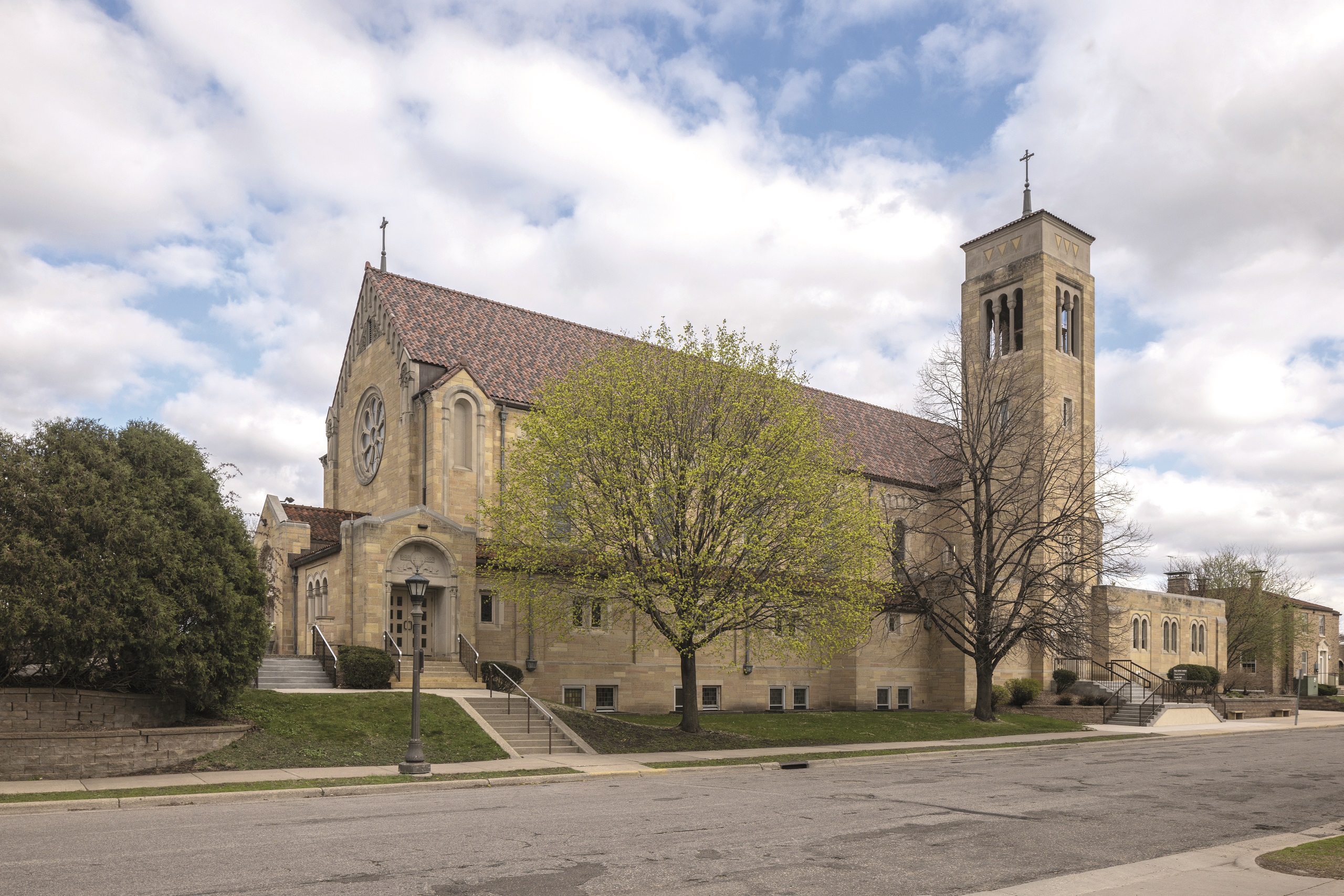 In September 1936, Fr. George Keefe was appointed founding pastor. Masses were celebrated in the auditorium of then Cretin High School. In April 1937, a building site for a church and school was chosen, at the southwest corner of Randolph Avenue and Albert Street. The property was acquired from an orphanage operated by the Sisters of St. Joseph. The new structure called for church and school facilities; the church was to seat 700 people and the school would have eight classrooms. Excavation of the new building began and proceeded quickly. In September 1937, Holy Spirit School officially opened, followed by a dedication of the church and school in October. On Christmas Eve 1949, a new basement church opened while the upper church was still being completed. The present church is a Lombard Romanesque building with Byzantine-style mosaics and was completed in 1955. The first church still stands and has been incorporated into the parish school.