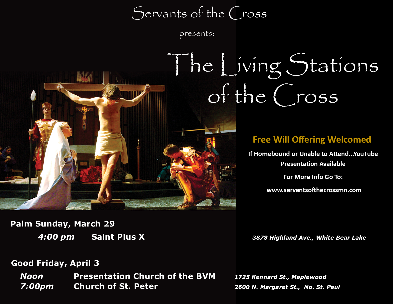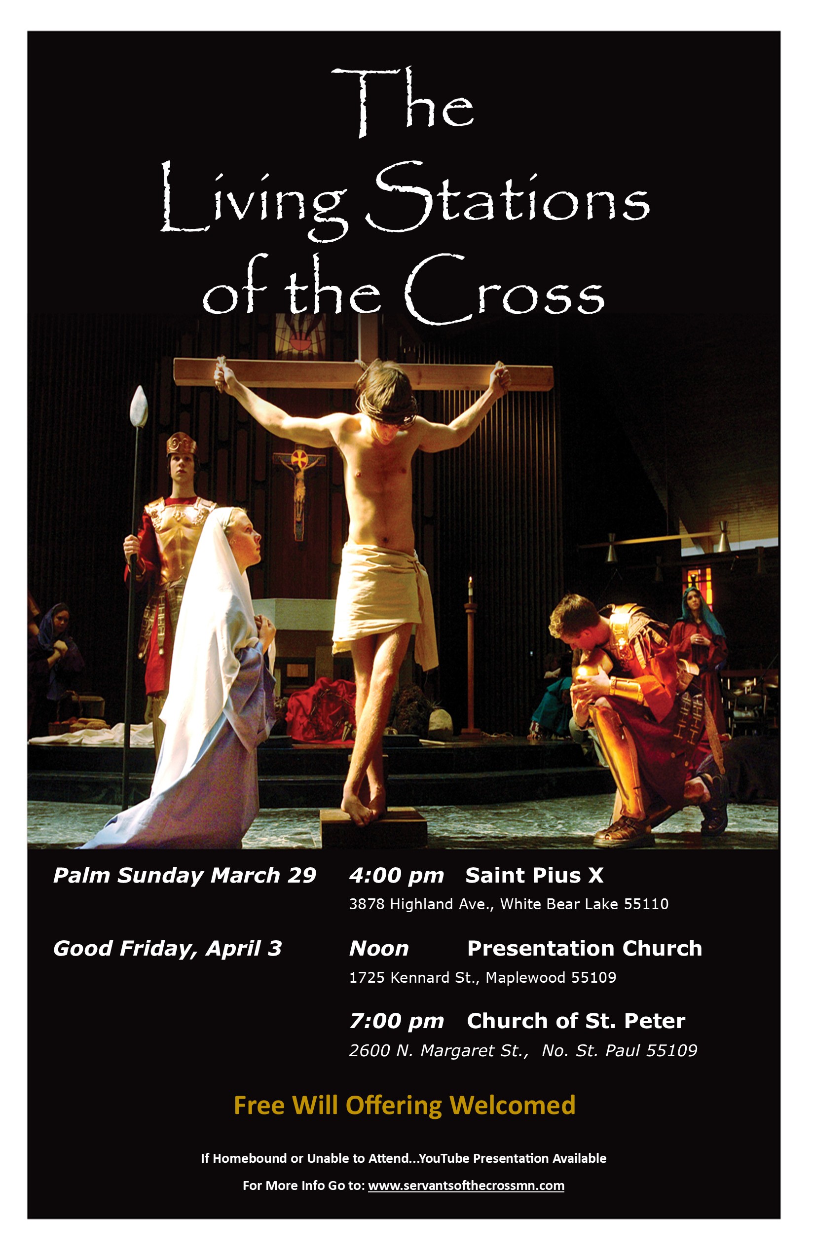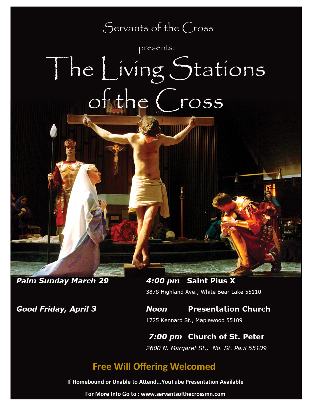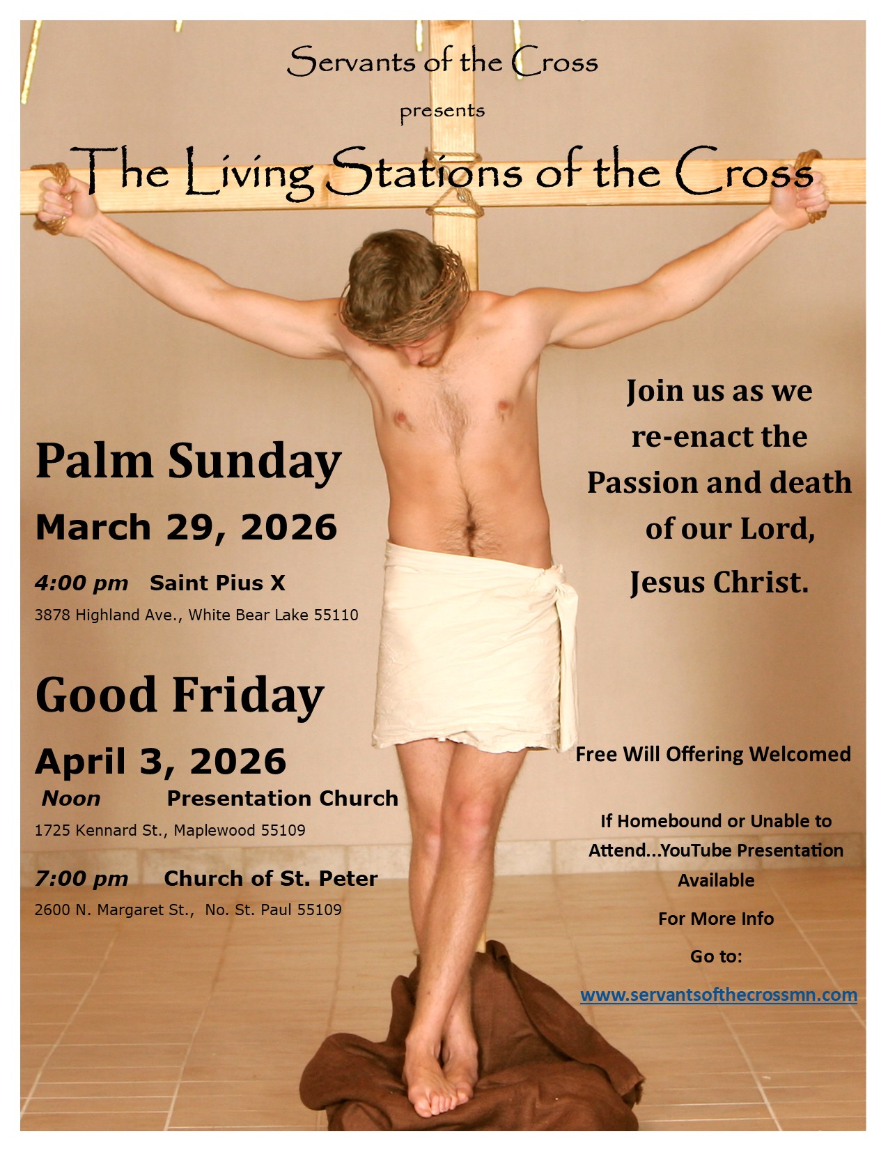 The Servants of the Cross is Catholic Lay Apostolate composed of several families in the Twin Cities archdiocese. This lent 82 youth from ages 7-18 will present the passion of our Lord Jesus Christ once on Palm Sunday and at two locations on Good Friday.