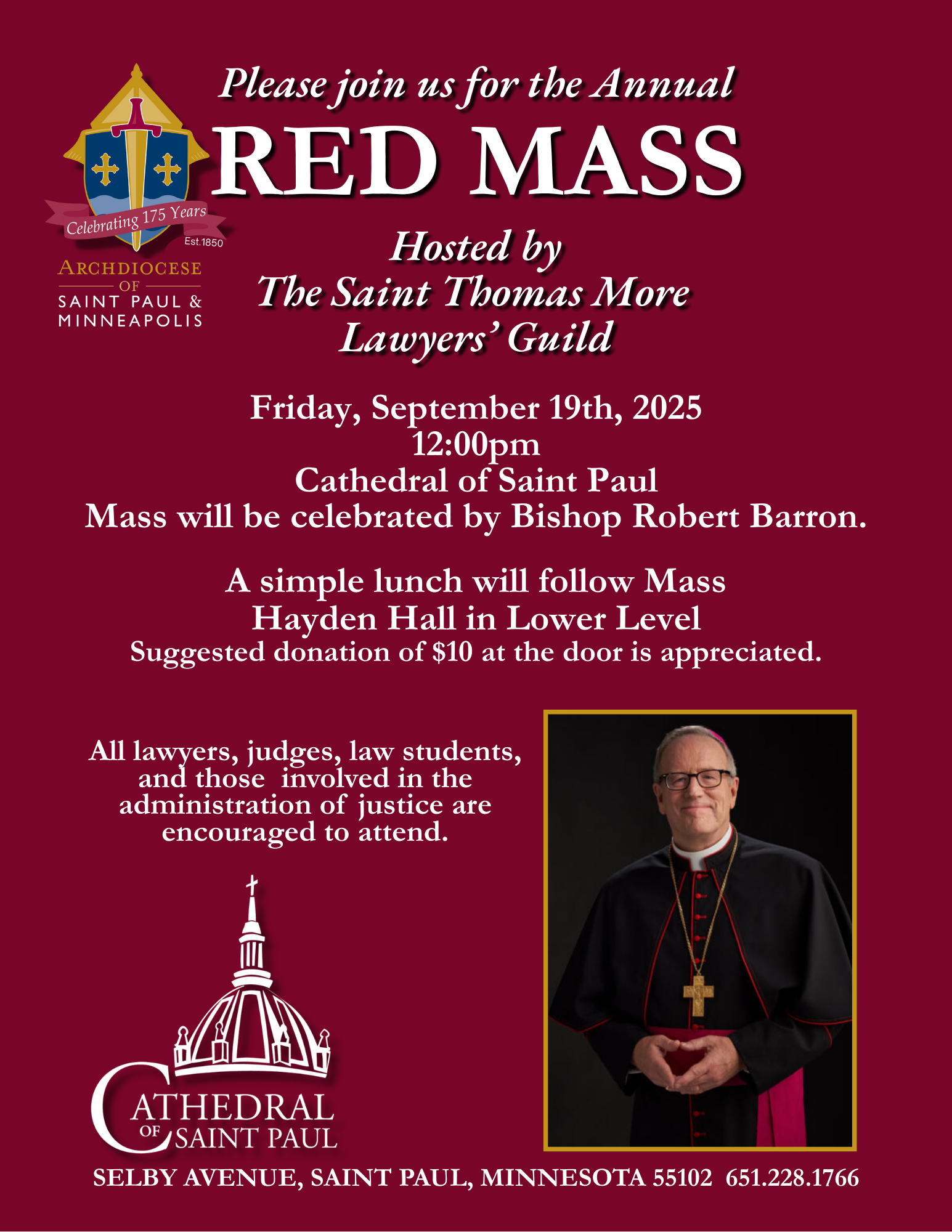 The annual Red Mass will be celebrated by Bishop Robert Barron.ย The Red Mass is sponsored by the St. Thomas More Lawyers Guild. The Red Mass is for all lawyers, judges, law students, and those involved in the administration of Justice.ย All are welcome to attend.