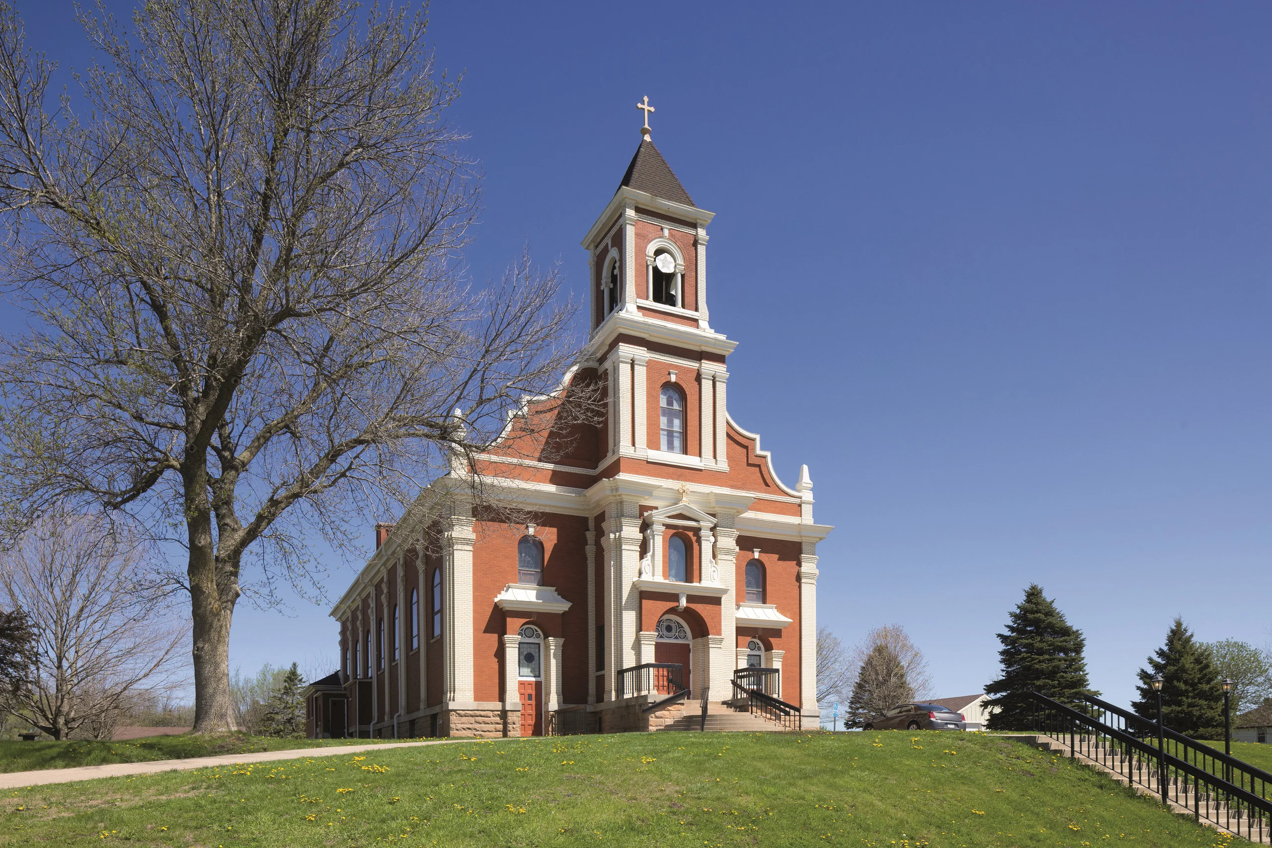 St. Mary’s roots can be traced back to the 1850s, when German pioneers with a strong Catholic faith settled in the area. In 1856, the faith-filled Catholics built their first church, a small log building. They named their parish after St. Mary Protectress, or Schutz, in German. The parish grew so fast that within two to three years a larger frame church was built. The community soon outgrew their second church and in 1864 built a stone church that faced to the west, toward the cemetery. In 1909, the present red-and-white brick church was erected. The architect was George Ries of St. Paul, who also designed St. Agnes in St. Paul. The present church incorporates a statue of Our Lady and Child dating back to 1862. The bells and baptismal font are from the 1864 church, and the cornerstone from the 1864 church has been preserved in the vestibule. Around 1869, the first school was built. It was led by Benedictine Sisters from St. Joseph, and then by the School Sisters of Notre Dame for nearly 100 years, until the school closed in 2009. During its lifetime, St. Mary’s School inspired an unusually large number of religious vocations, including 18 priests, 40 sisters and several religious brothers. For more than 160 years, St. Mary, sitting majestically on the hill overlooking the city, has been a beacon of faith in the New Trier community.
